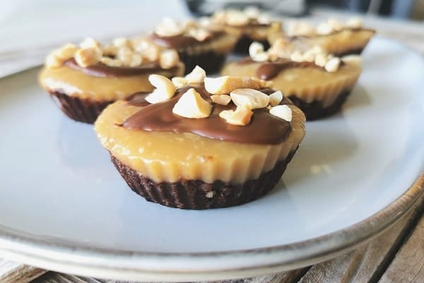 OPIS POSTOPKA: Najprej si pripravimo sestavine za osnovo. Vse naštete sestavine damo v posodo in dobro premešamo. Sama sem za pripravo tortic uporabila silikonske modelčke za muffine. V vsak model damo malo mase za osnovo (enakomerno jo razporedimo med 8 modelov). S prsti ali žlico maso dobro pritisnemo ob dno. Nato se lotimo priprave nadeva. Za nadev damo vse sestavine v sekljalnik in mešamo, da dobimo gladko maso. Maso razporedimo v modele in damo v zamrzovalnik za 4-6 ur, da se strdi. Ko so tortice dovolj ohlajene jih brez težav odstranimo iz modelov. Prelijemo jih s stopljeno čokolado in posujemo s praženimi arašidi. Hranimo jih v hladilniku.