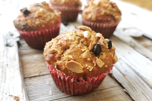 OPIS POSTOPKA: V posodi zmečkamo banane in dodamo ostale mokre sestavine. Dobro premešamo. Nato dodamo vse naštete suhe sestavine razen čokolade. Premešamo, da se suhe in mokre sestavine povežejo, nato dodamo še čokoladne kapljice. Maso nadevamo v pripravljene modelčke za muffine in pečemo pri 180 stopinjah 20-25 minut.