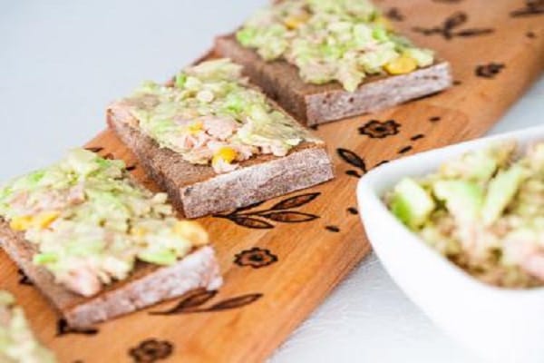 Avokadov namaz s tuno in koruzo na rženem kruhu