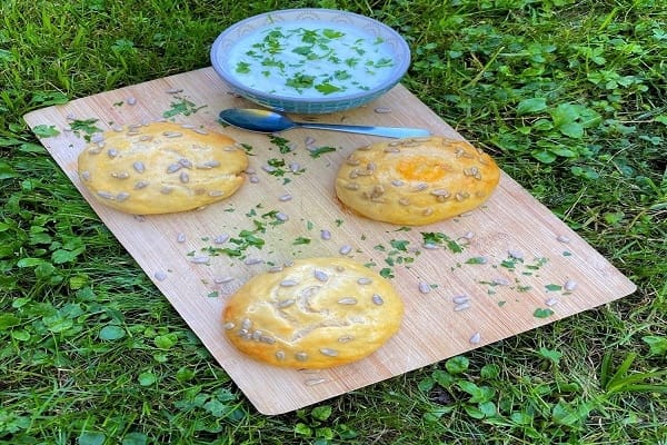 POSTOPEK: Moko, pecilni prašek, sol in Skyr zmešamo v posodi, tako da nastane lepo oblikovana kepa. Zmes je malo bolj lepljiva od navadne mase za kruh. Oblikujemo mini bombetke, ki jih premažemo z razžvrkljanim jajcem ter posujemo s semeni. Pečemo približno 25-30 minut na 180 stopinj Celzija.