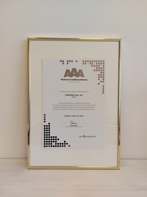 Cinkarna Celje ostaja eno najstabilnejših podjetij v Sloveniji. Prejela je mednarodni Platinasti certifikat bonitetne odličnosti 2023, ki potrjuje zanesljivost, kredibilnost in odličnost poslovanja v odnosu do vseh deležnikov.