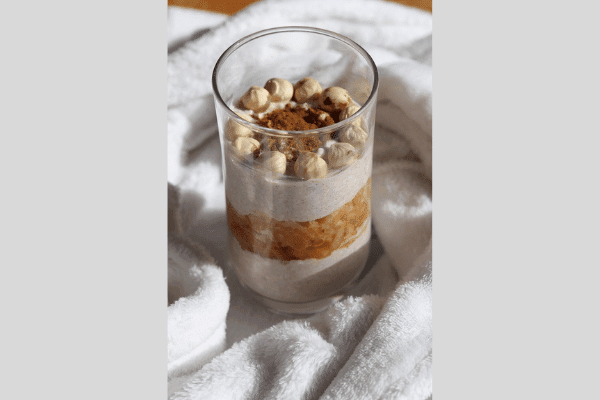 OPIS POSTOPKA: Jabolka olupi in naribaj v posodico. Čez njih posuj eritritol in jih pokapaj z limoninim sokom ter posuj s cimetom. V drugi posodi dobro zmešaj skuto, grški jogurt in zopet posuj s cimetom ter eritritolom. Za dodaten vnos beljakovin lahko dodaš še merico vanilijevih beljakovin. Nato v steklen kozarec nadevaj prvo plast zmesi skute, nato jabolka in ponovno zmes skute. Na vrhu dodaj lešnike, ki jih predhodno peci v pečici na 180 stopinj Celzija, da postanejo hrustljavi. Jed lahko imaš za sladico ali pa kot fit malico/zajtrk. Dober tek!