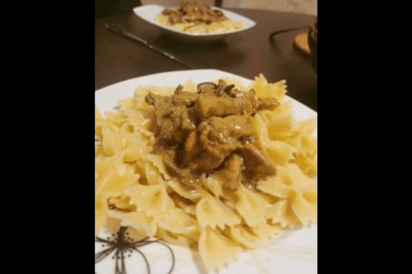 OPIS POSTOPKA: Govedino narežemo na tanke trakce. Popečemo jo na olivnem olju (cca 5 minut) in solimo ter popramo. Pečene goveje trakce damo na krožnik. V ponvi popražimo na drobne koščke nasekljano šalotko. Na šalotki popečemo jurčke in jih nekaj minut dušimo. Dodamo govedino in tri jedilne žlice kisle smetane. Po želji dodamo malo vode. Malce še pokuhamo, dodamo sveže sesekljan peteršilj in postrežemo. Zraven lahko ponudimo testenine ali kruhove cmoke.