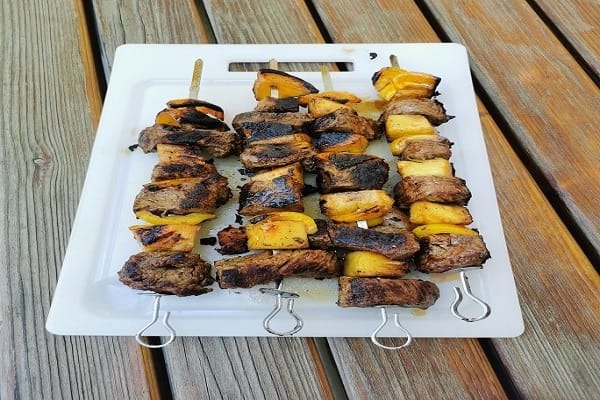 OPIS POSTOPKA: Pljučno govedino narežemo na zrezke (2 – 3 cm debele), nato pa še na kocke. Ananas prav tako olupimo, odstranimo srednji trd del in narežemo na kocke. Papriko operemo, odstranimo semena in zrežemo na kvadrate. Na kovinska (ali lesena) nabodala za žar natikamo koščke mesa, ananasa in paprike. Če uporabljamo lesena nabodala, jih pol ure pred peko namočimo v vodo, da ne zagorijo. Začinimo s poprom, soljo in začimbami po želji (kajenska paprika, curry, mediteranska mešanica…). Pečemo na žaru (ali v ponvi ma štedilniku) na vsaki strani 5 minut na vsaki strani oziroma dlje, če želimo bolj skozi pečeno meso (well done). Čas peke je odvisen od debeline kosov mesa.