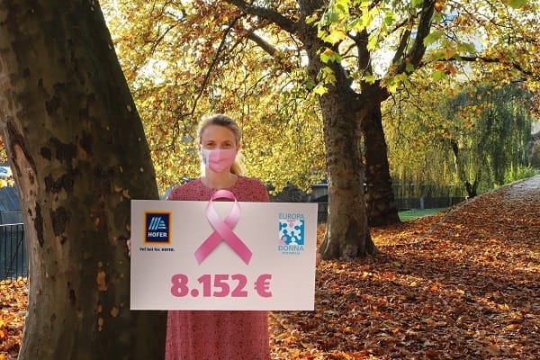 Lukovica, 10. november 2020: Ob mednarodnem mesecu osveščanja, rožnatem oktobru, so pri podjetju HOFER znova opominjali na pomembnost preventive. Tudi tokrat so podali roko Združenju Europa Donna Slovenija in s prodajo t. i. dobrodelnih šampinjonov v roza embalaži s pomočjo kupcev zbrali 8152 evrov. V petih letih so boju proti raku dojk namenili že več kot 35.000 evrov.