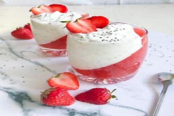 OPIS POSTOPKA: Najprej zblendamo jagode, 2 jedilni žlici medu (več ali manj po okusu glede na sladkost jagod) in limonin sok ter 1 dl vode, vse do gladkega. Nato damo v lonec agar agar in 1 dl vode, premešamo in segrevamo do vretja, mešamo ter pokuhamo 1 minuto, nato malo ohladimo. Počasi vmešamo pripravljene jagode in nato pripravljeno vlijemo v 4 kozarčke. Počakamo, da se strdi. Nato stepemo smetano do kremastega, ne do čisto trde teksture. Vmešamo 1 jedilno žlico medu ter chia semena in razporedimo v kozarčke. Takoj postrežemo ali shranimo v hladilnik.
