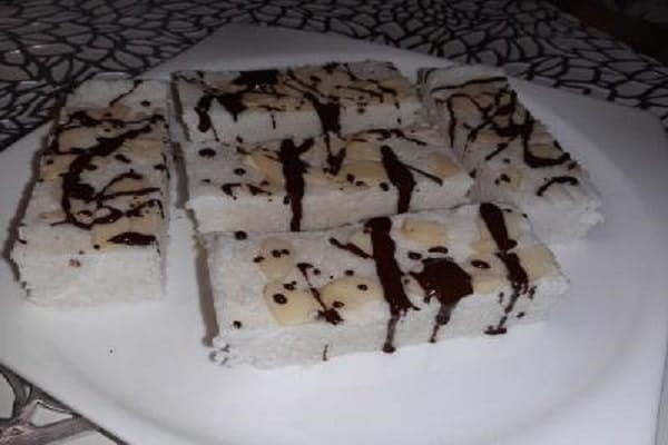 OPIS POSTOPKA: V ponvi na nizki temperaturi zagrejemo kokosovo mleko, olje ter javorjev sirup. Dodamo kokosovo moko, dobro premešamo. Pekač obložimo s peki papirjem. Zmes razporedimo po pekaču in preko posujemo nastrgane mandlje. Vse skupaj postavimo v zamrzovalnik za vsaj eno uro. Čokoladne kapljice ter kokosovo olje zagrejemo, da se čokolada stopi. Prelijemo preko kokosovih rezin.