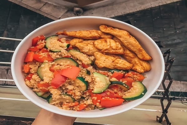 OPIS POSTOPKA: Najprej na poljubne koščke narežeš piščanca in ga za nekaj časa pustiš marinirati v začimbah (jaz sem uporabila malenkost olivnega olja, malo limoninega soka, sladko papriko v prahu, sol in poper). Potem narežeš čebulo in ostalo poljubno zelenjavo (v mojem primeru papriko in bučko) ter vse skupaj popražiš na olivnem olju. Ko je zelenjava popražena, ji dodaš kvinojo in jo skupaj z zelenjavo popražiš še za par minutk (1-2min). Sestavinam dodaš vodo v razmerju 1:2 (kvinoja:voda), polovico jušne kocke (lahko tudi druge poljubne začimbe) in jed kuhaš dokler ne izhlapi vsa voda. Medtem spečeš piščanca na poljuben način. Jaz sem ga spekla v cvrtniku na vroč zrak (air fryer), če pa tega nimaš, pa ti predlagam da ga popečeš na ponvi z malenkost olivnega olja. Ko voda izhlapi in je piščanec pečen, si oboje skupaj nadevaj na krožnik in samo uživaj.