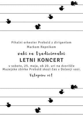 Vabljeni na Letni koncert Pihalnega orkestra Prebold, ki bo v soboto, 25.5. ob 20.00 na dvorišču Muzejske zbirke Prebold, Savinjska regija. Vstop prost.