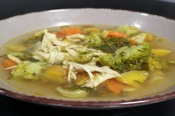 Hranljiva domača juha s piščancem, veliko zelenjave in kurkumo. Juha ne vsebuje glutena, mleka in je primerna za razne diete.