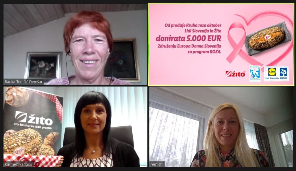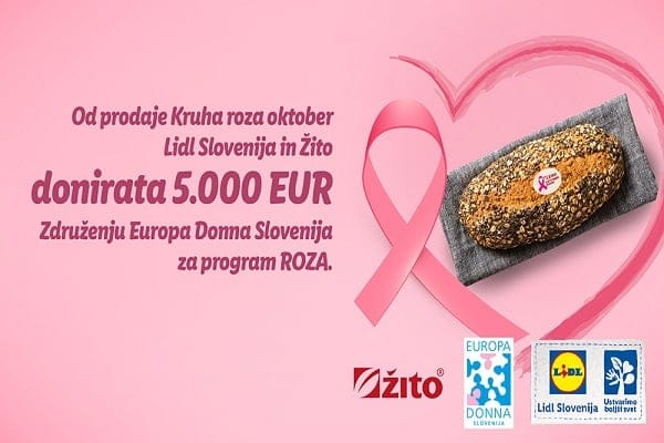 Žito in Lidl Slovenija sta Europi Donni – Slovenskemu združenju za boj proti raku dojk predala donacijo v višini 5.000 evrov. Sredstva, ki sta jih podjetji v skupni akciji s prodajo Kruha roza oktober zbirali v oktobru, mesecu ozaveščanja o raku dojk, bodo namenjena za podporo programu ROZA.* Ta ponuja psihosocialno podporo bolnicam, njihovim otrokom ter drugim svojcem obolelih za rakom dojk in rodil.