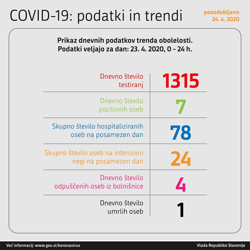 V četrtek je bilo ob 1315 testiranjih potrjenih sedem okužb z novim koronavirusom, zabeležili pa so tudi eno novo smrtno žrtev, kažejo vladni podatki. Hospitaliziranih je bilo 78 oseb, od teh jih je 24 potrebovalo zdravljenje na intenzivni negi. Skupno so v Sloveniji do zdaj našteli 1373 potrjenih okužb, umrlo pa je 80 bolnikov s covidom-19.