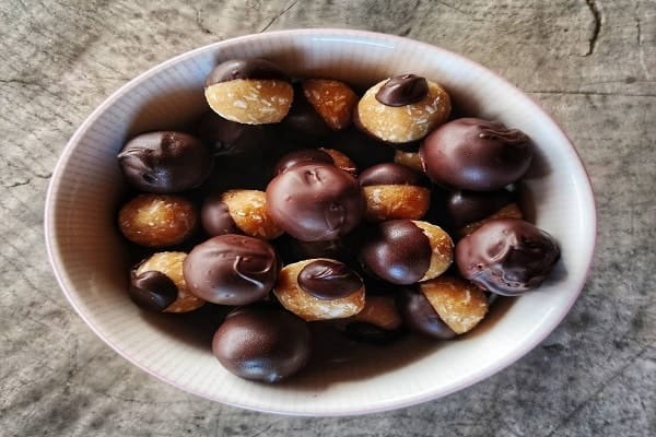 OPIS POSTOPKA: Najprej skupaj dobro zmešamo mandljevo in arašidovo maslo, nato dodamo mleko in vse suhe sestavine. Dobro premešamo in oblikujemo kroglice. Nad paro stopimo čokoladno in vanjo pomočimo kroglice, katere nato hranimo v hladilniku.