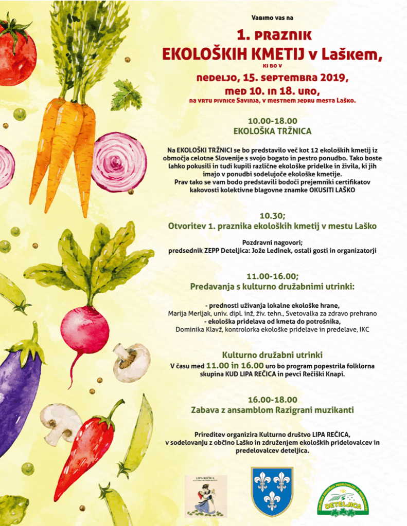 Med 10. in 18. uro se bo na ekološki tržnici predstavilo 12 ekoloških kmetij, organizirani bosta predavanji na temo uživanja lokalne hrane in ekološke pridelave. Za zabaven del pa bodo poskrbeli folklorna skupina KUD Lipa Rečica, pevci Rečiški Knapi ter ansambel Razigrani muzikanti.