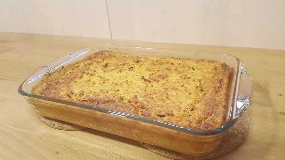 Maso vlijemo v namaščen pekač in poravnamo. Pečemo na 180 stopinjah približno 45 minut.