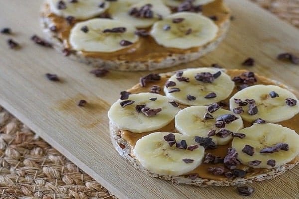 OPIS POSTOPKA: Na vaflje namaži arašidovo maslo, dodaj narezano banano in potrosi malo kakavovih zrnc. Ta prigrizek je primeren za tiste dni, ko nimaš toliko časa za pripravo jedi.