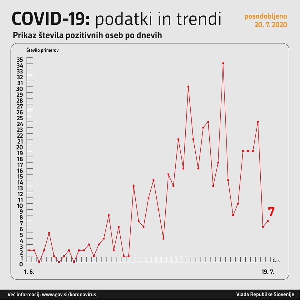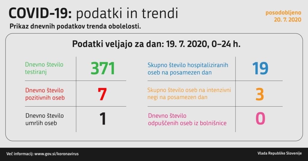 V nedeljo so ob 371 opravljenih testih potrdili sedem pozitivnih primerov. 19 oseb zaradi bolezni covid-19 potrebuje bolniško zdravljenje, trije na oddelku za intenzivno nego.