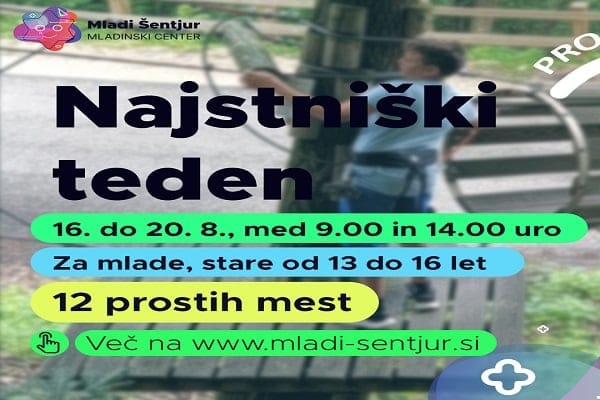 Na Mladinskem centru Šentjur, od 16. do 20. avgusta, pripravljajo teden počitniških aktivnosti za najstnike v Šentjurju, Savinjska regija. Aktivnosti