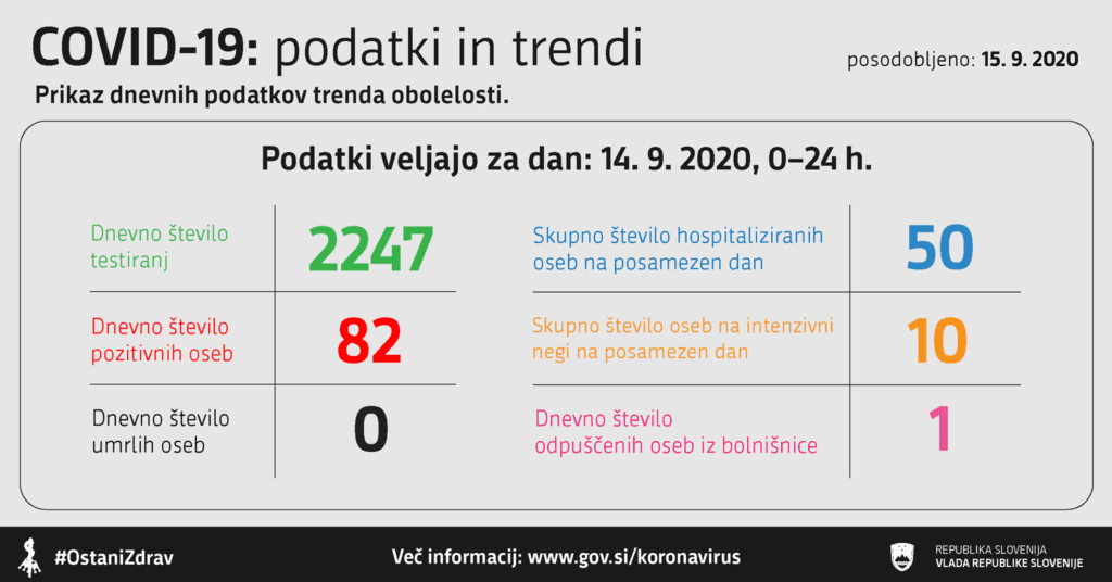 V ponedeljek so v Sloveniji opravili 2247 testov na okužbo z novim koronavirusom, 82 jih je bilo pozitivnih, je vlada objavila na Twitterju. V bolnišnici se zdravi 50 bolnikov s covidom-19, deset jih potrebuje intenzivno zdravljenje, od tega jih devet diha s pomočjo ventilatorja. Eno osebo so iz bolnišnice odpustili, umrl ni nihče.