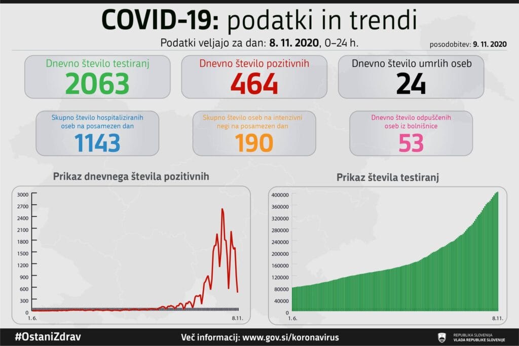 V nedeljo so po vladnih podatkih opravili 2063 testov na novi koronavirus in potrdili 464 novih okužb, pozitivnih je bilo torej 22,49 odstotka testov. Umrlo je 24 bolnikov s covidom-19, v bolnišnicah se jih je zdravilo 1143, 190 jih je potrebovalo intenzivno nego. Iz bolnišnic pa so jih odpustili 53, je vlada objavila na Twitterju.
