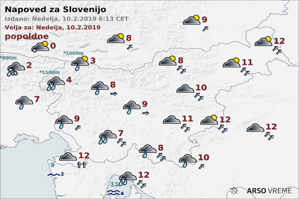 Danes bo pretežno oblačno. V zahodni ter delu osrednje in južne Slovenije bo občasno rahlo deževalo. Pihal bo okrepljen jugozahodni veter, ob morju popoldne in zvečer jugo. Najvišje dnevne temperature bodo od 7 do 12, v alpskih dolinah okoli 3 °C.