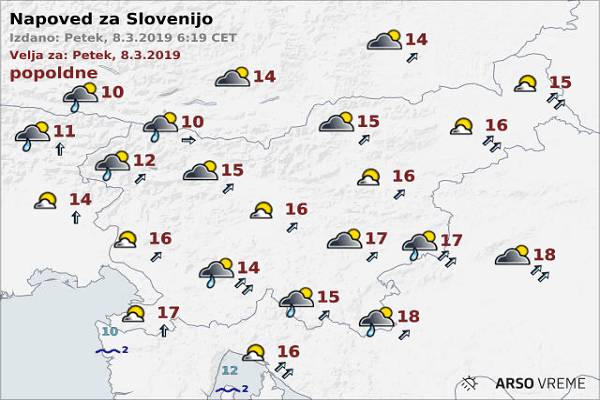 Popoldne bo delno jasno s spremenljivo oblačnostjo, občasno ponekod pretežno oblačno. Ponekod bodo kratkotrajne plohe. Pihal bo jugozahodni veter, ob morju jugo. Temperature bodo od 11 do 18 °C.