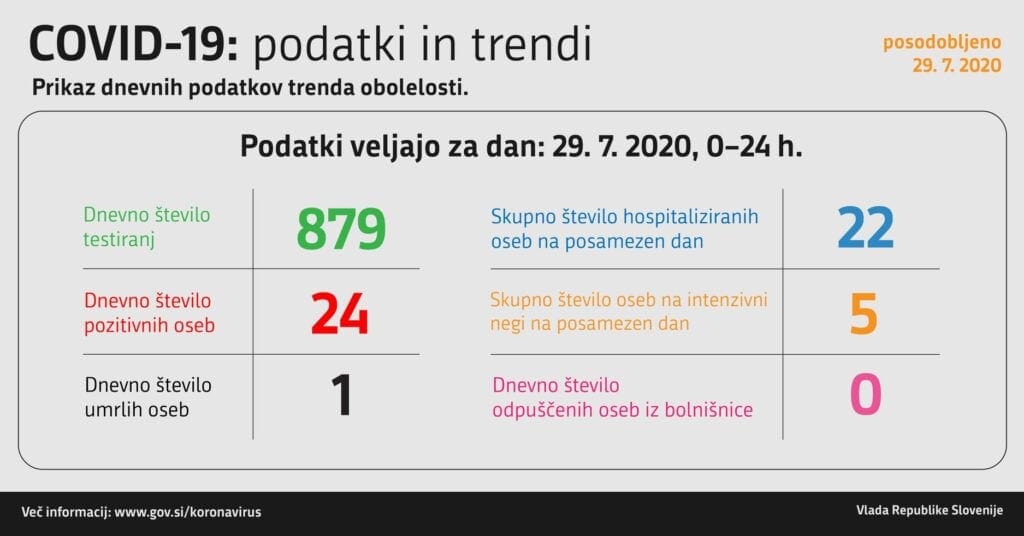 Včeraj so v Sloveniji opravili 879 testiranj na novi koronavirus, pozitivnih je bilo 24 primerov, objavlja Sledilnik Covid-19. V bolnišnici se zdravi 22 obolelih, kar je eden več od včeraj, prav tako je en bolnik več na intenzivni negi (5), trije potrebujejo respirator. Vlada je najprej sporočila, da sta v sredo umrla dva bolnika s covidom-19, vendar so pozneje podatek popravili na eno osebo,